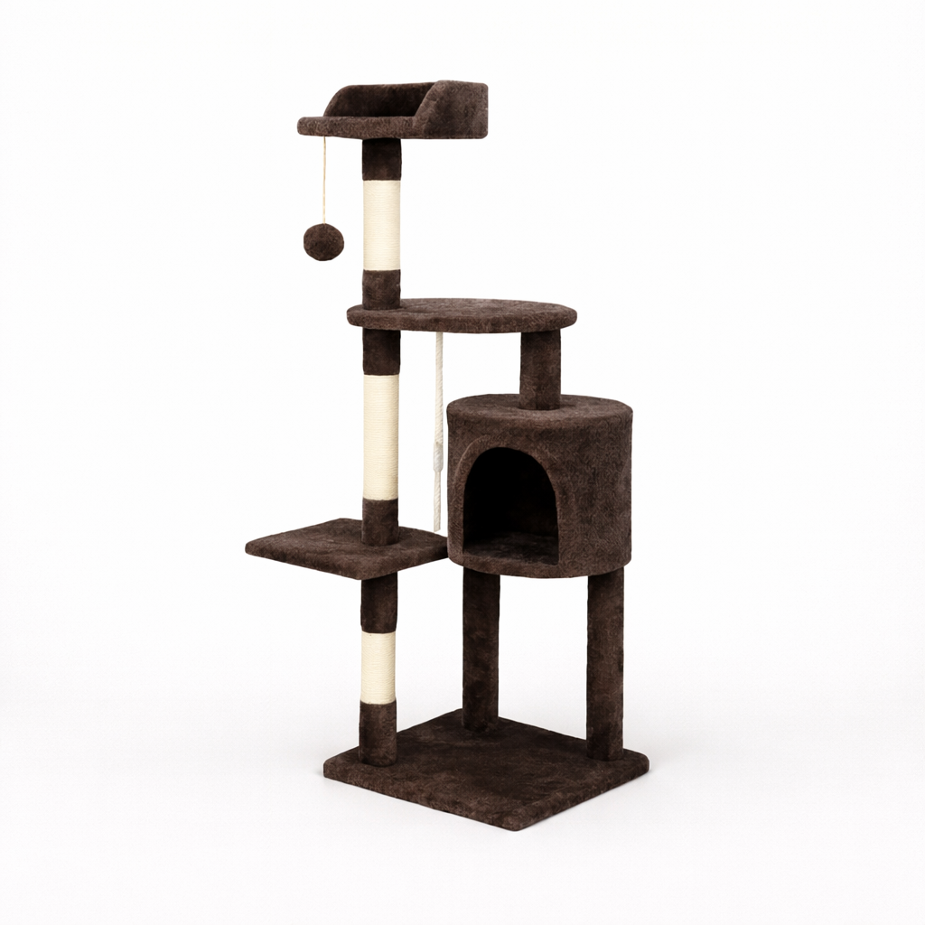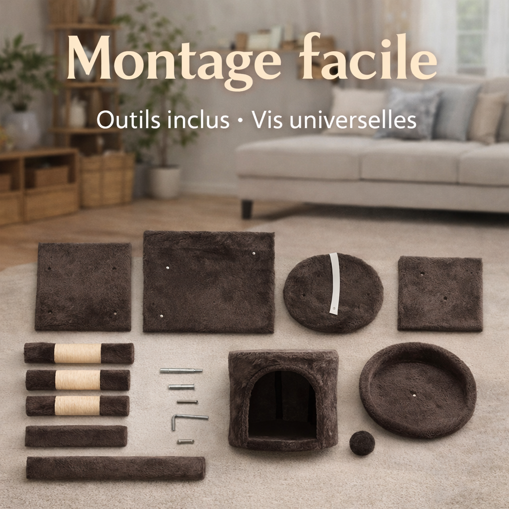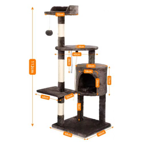 Arbre à chat de 112 cm avec plusieurs plateformes, niche, perchoir supérieur et poteaux en sisal. Il comprend un pompon suspendu et une corde en sisal pour le jeu. La structure est en panneaux de particules et peluche. Le produit inclut l’arbre à chat complet avec plateformes et niche, les trois poteaux en sisal, le pompon suspendu, la corde en sisal, une sangle anti-basculement, les outils de montage, les vis universelles et le manuel d’instructions.