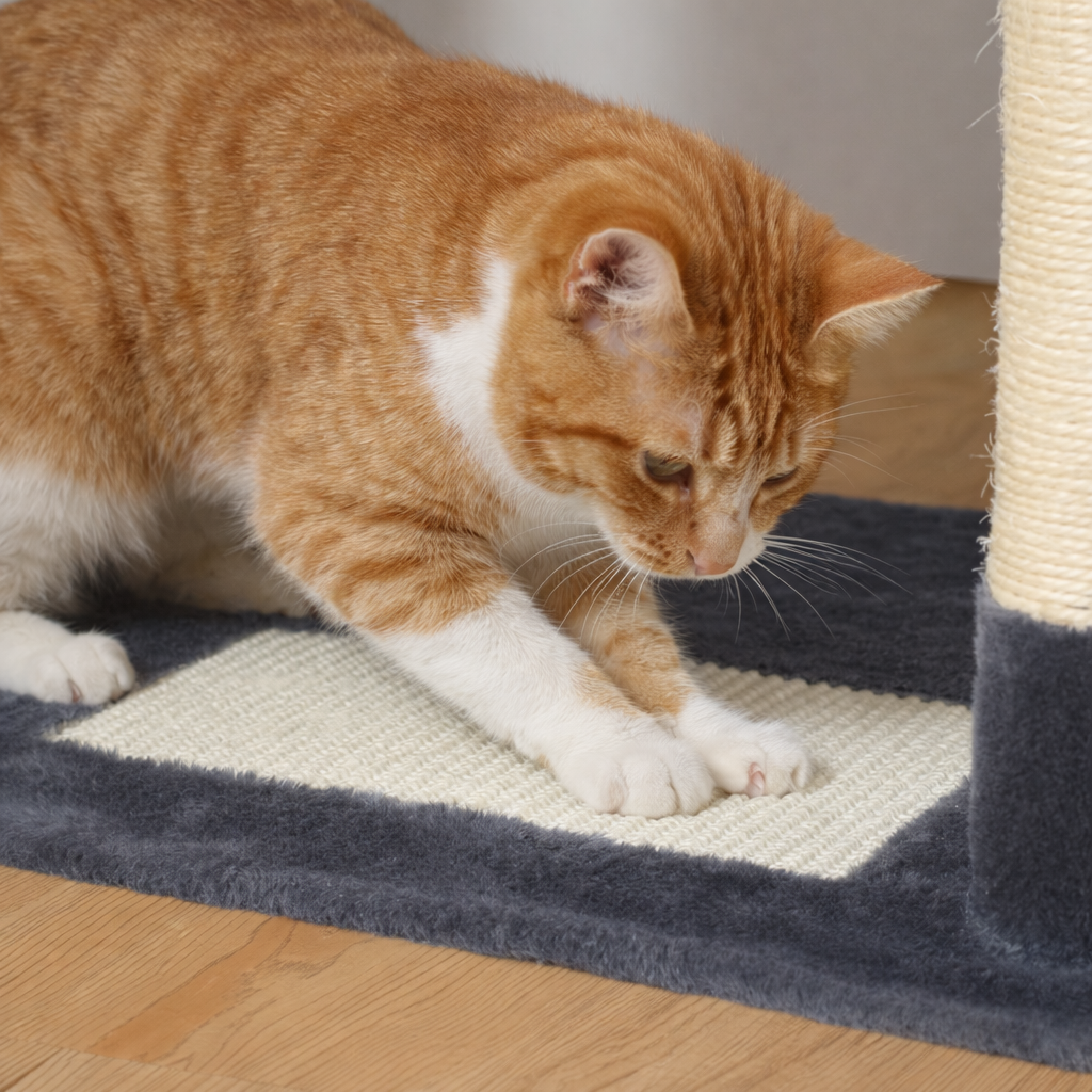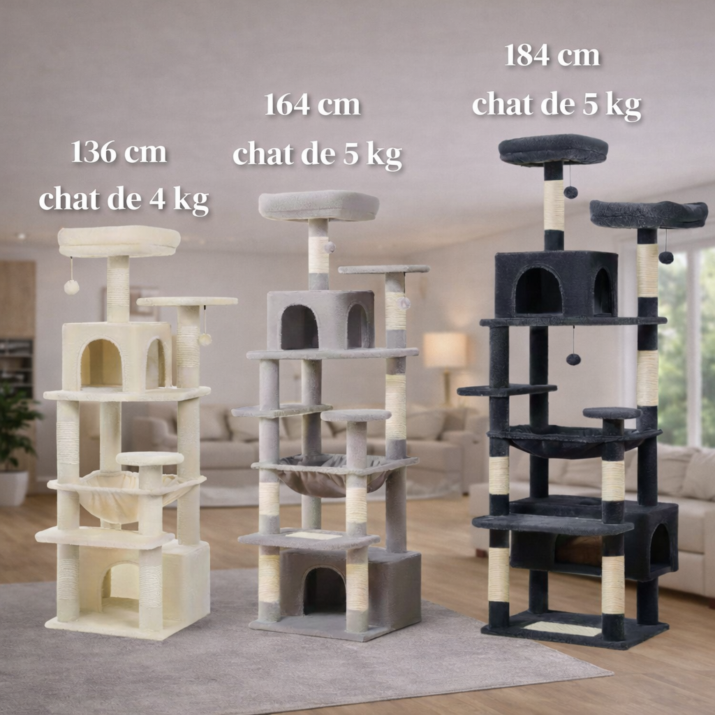 Arbre à chat multi-niveaux avec hauteur réglable entre 136 et 184 cm. Il comprend un hamac suspendu, un condo rectangulaire et deux perchoirs supérieurs avec housses amovibles. La structure comporte sept poteaux en sisal naturel et une zone de grattage à la base. Des pompons de jeu remplaçables et une balle sont inclus. Le produit inclut l’arbre à chat complet, les perchoirs supérieurs avec housses, le hamac, le condo, les pompons et la balle, ainsi que le kit anti-basculement pour fixation murale.