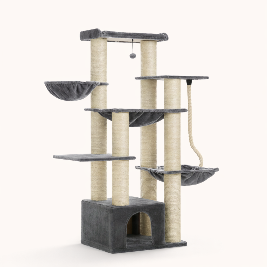 Arbre à chat de 170 cm avec sept niveaux et plusieurs plateformes. Il comprend trois hamacs, une maison pour chat intégrée à la base et treize poteaux à griffer en sisal naturel. La base est double couche et un dispositif anti-basculement est inclus. Le produit inclut l’arbre à chat complet, la maison, les hamacs, les poteaux à griffer, une balle suspendue, le dispositif anti-basculement et le manuel d’instructions.